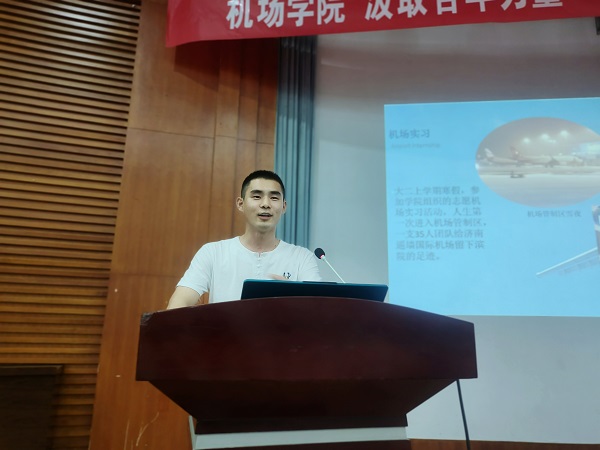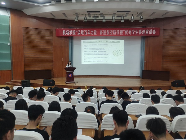 活动伊始,主持人对五位优秀学生代表进行简单介绍,并宣布本次宣讲会正式开始。在宣讲中,五位学生代表通过PPT的形式,结合自己的大学生活和自身经历,向同学们分享经验,提出建议。首先,优秀学生崔庆敏在“三下乡”、“志愿服务”、“机场实习”和“学科竞赛”等方面向大家做了详细的介绍并提出合理化建议。她基于自己的考研经历,建议大家找准定位,提高学习效率,希望同学们以梦为马,不负韶华,使自己的大学之路精彩纷呈!接着,吕莹莹用简洁明确的发言,讲解了“如何做好一位大学生?”她表示,在思想上,要积极向上,自觉接受党的教育和领导。同时建议大家积极参加各类活动,提高个人素质水平。宋雨馨、周庆永两位优秀学生则呼吁各位同学通过实践为祖国民航建设奉献青春力量。随后,赵瑞泽同学以幽默风趣的语言和丰富多彩的演讲内容赢得现场观众的阵阵掌声,将此次宣讲会推向高潮。他始终强调,同学们应当把学习放在首位,希望各位同学敢于探索未知领域,不断丰富自己的精神世界,为青春负责,为人生负责。在同学们热烈的掌声中,本次活动圆满结束。