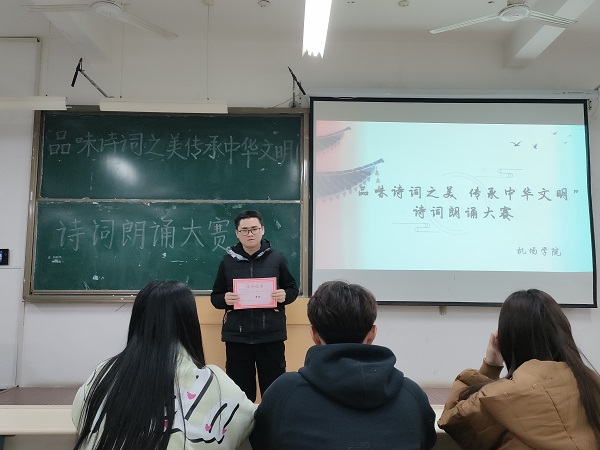 为提高同学们的人文素质和道德情操,进一步弘扬中华民族优秀传统文化,推动校园文化建设,12月8日晚,欧冠官网于工科楼2-112教室举办“品味诗词之美,传承中华文化”诗词朗诵比赛。欧冠官网学生评委团及2021级全体同学到场参加了本次活动。