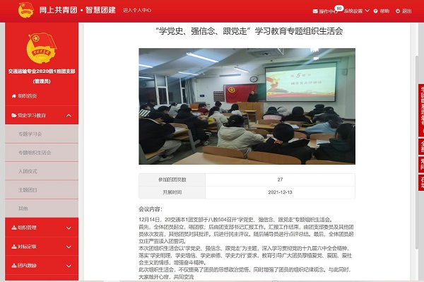 为引导广大青年团员深入学习贯彻党的十九届六中全会精神、习近平总书记“七一”重要讲话精神,贯彻落实“学史明理、学史增信、学史崇德、学史力行”要求,12月5日至17日,欧冠官方网站入口各团支部开展了“学党史、强信念、跟党走”专题组织生活会。