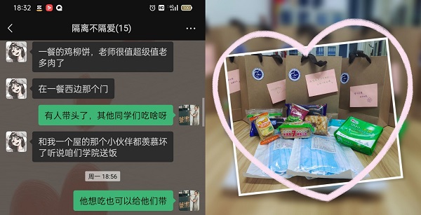 欧冠官方网站入口针对隔离学生组建了志愿服务工作小队,采用“线上+线下”的方式为隔离学生送去温暖。辅导员老师们通过微信、视频、电话等形式,提前了解集中隔离学生的生活需求,将所需物资采购齐全,确保每位学生能在隔离期间保持营养健康,叮嘱大家要严格遵循集中隔离观察点的工作要求和操作流程,提高防范意识,做好个人防控,调整好心态,保持正常的作息规律,学院会一直并及时地解决同学们在生活上的困难和需求,进一步增强大家战“疫”必胜的信心与决心。
