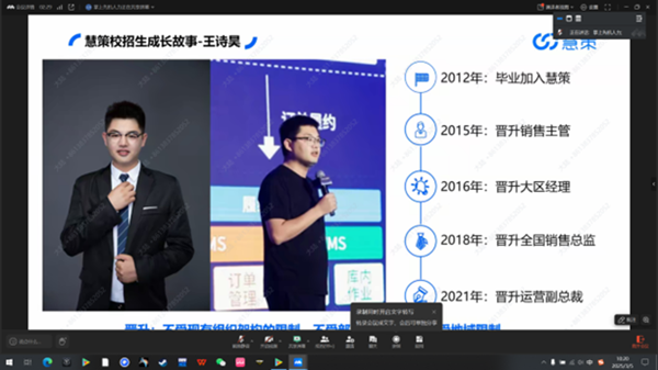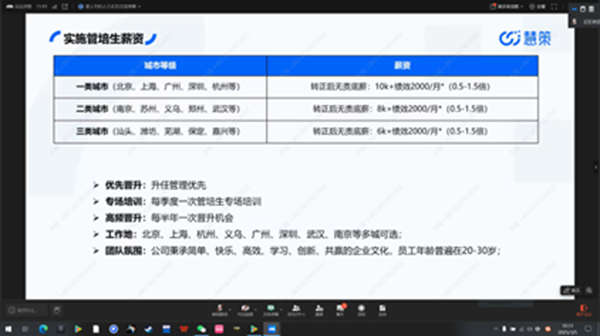 此次活动以视频会议的形式面向大家,向毕业生们展现了慧策集团迅猛的发展势头,以及其内部通畅的人才晋升通道。宣讲会期间,毕业生们通过线上平台踊跃提问,就岗位要求、职业发展、培训机制等问题与慧策集团的招聘负责人进行了深入交流。慧策的“鹰系列”培养计划是其人才发展的核心动力,这一基于岗位发展的人才培养体系,包含专业序列和管理序列的梯队建设,为不同发展路径的员工提供清晰成长规划,助力校招生在公司长远发展。此次校招岗位丰富,涉及产品、研发、销售、售后等多个领域。其中,销售管培生、实施管培生、软件售后技术支持(天津)、职能类(北京)等岗位需求较大。招聘流程包括宣讲会、网申/内推、笔试/测评、面试和发放Offer。慧策集团福利待遇优厚,提供无责底薪、补贴、高额提成/项目奖金以及六险一金,还有双休、法定节假日休息和带薪年假。同时介绍报名网申地址:https://huicecom.zhiye.com/Campus ,号召想报名的同学通过网申及时投递简历。