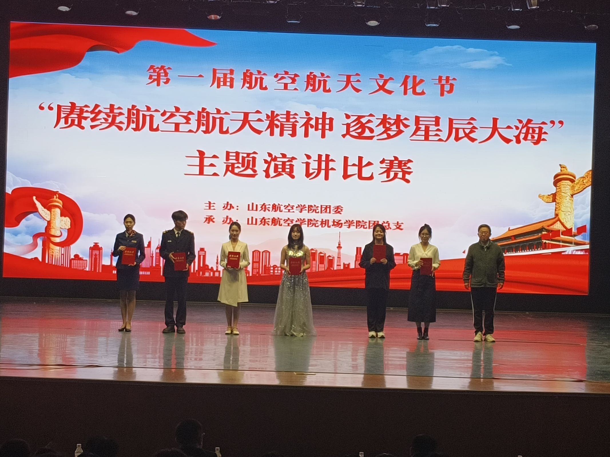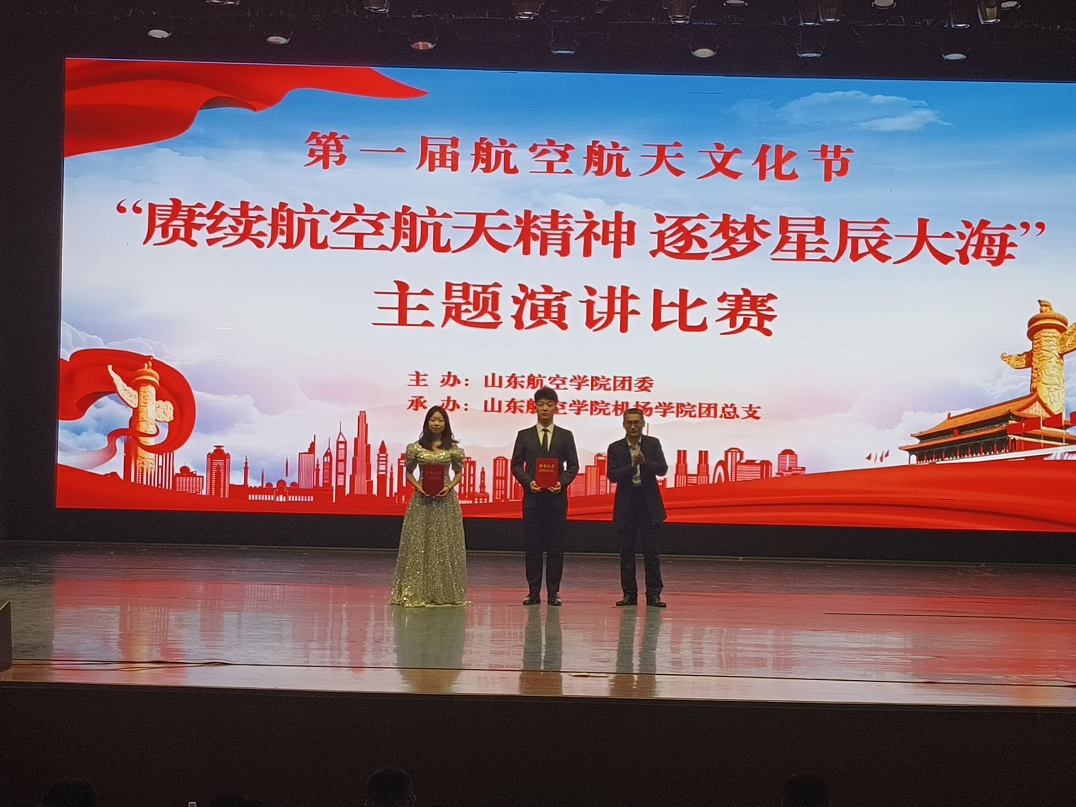 4月15日,由校团委主办、欧冠官方网站入口承办的第一届航空航天文化节“赓续航空航天精神,逐梦星辰大海”主题演讲比赛决赛在学苑会堂成功举办。本次比赛邀请中国文化信息协会文化产业专业委员会特聘会员、山东朗诵艺术家协会会员程锐、山东航空学院合作发展处副处长李军、招生就业处副处长代林、国有资产管理处副处长宋立军、学生工作处副处长于峰担任比赛评委,欧冠官方网站入口党委书记、党委副书记以及全体辅导员老师出席本次活动,11支学院代表队参赛。