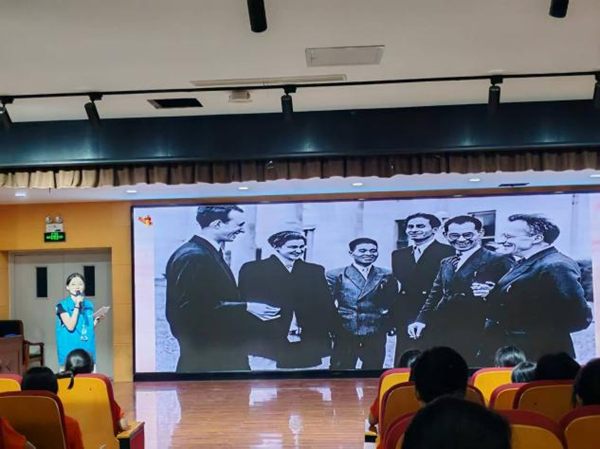宣讲正式开启,宣讲团成员以“从剑桥学子到戈壁驼铃”为主线,娓娓道来程开甲院士的人生轨迹。她先简要讲述院士在英国剑桥大学的留学经历:在导师玻恩的指导下深耕理论物理,却在国家召唤时毅然放弃国外优渥条件,带着几箱科研书籍踏上归途。