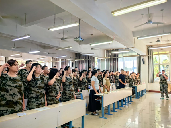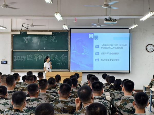 会议结合《山东航空学院2025级学生军事技能训练工作实施方案》,重点阐明军训内容、军训日程和军训纪律条例,要求参训学生在军训期间严格遵守纪律,提高安全意识,做到有情况及时汇报,有问题及时反映。在动员讲话中,靳雪银首先强调了军训的核心价值,指出本次军训不仅是体能和技能的锻炼,更是一堂深刻的精神课。随后,她介绍了本次军训设置的丰富多样的活动与评比,包括军歌红歌合唱比赛、叠军被大赛、内务卫生评比、分列式阅兵评比、战地医疗救护大赛以及格斗基础科目评比等,这些活动和评比不仅是对大家训练成果的检验,更是培养大家纪律意识、协作能力和集体荣誉感的重要载体,对于厚植同学们的家国情怀、锤炼不畏艰难的意志品质,具有不可替代的作用。接着,通过展示近年来在军训工作中的突出成果和取得的优异成绩,进一步激发了新生们的集体荣誉感和争先意识,并希望2025级新生能以此为激励,迅速进入状态,以昂扬的斗志和饱满的热情投入到训练中,力争在本届军训中交出一份同样出色的答卷。会议最后,在领誓人的带领下,全体新生高举右拳,庄严宣誓。他们承诺将以钢铁般的纪律意识和坚韧不拔的毅力,严格遵守军训要求,绝对服从教官指令,全身心投入训练,以优异的成绩完成军训任务。