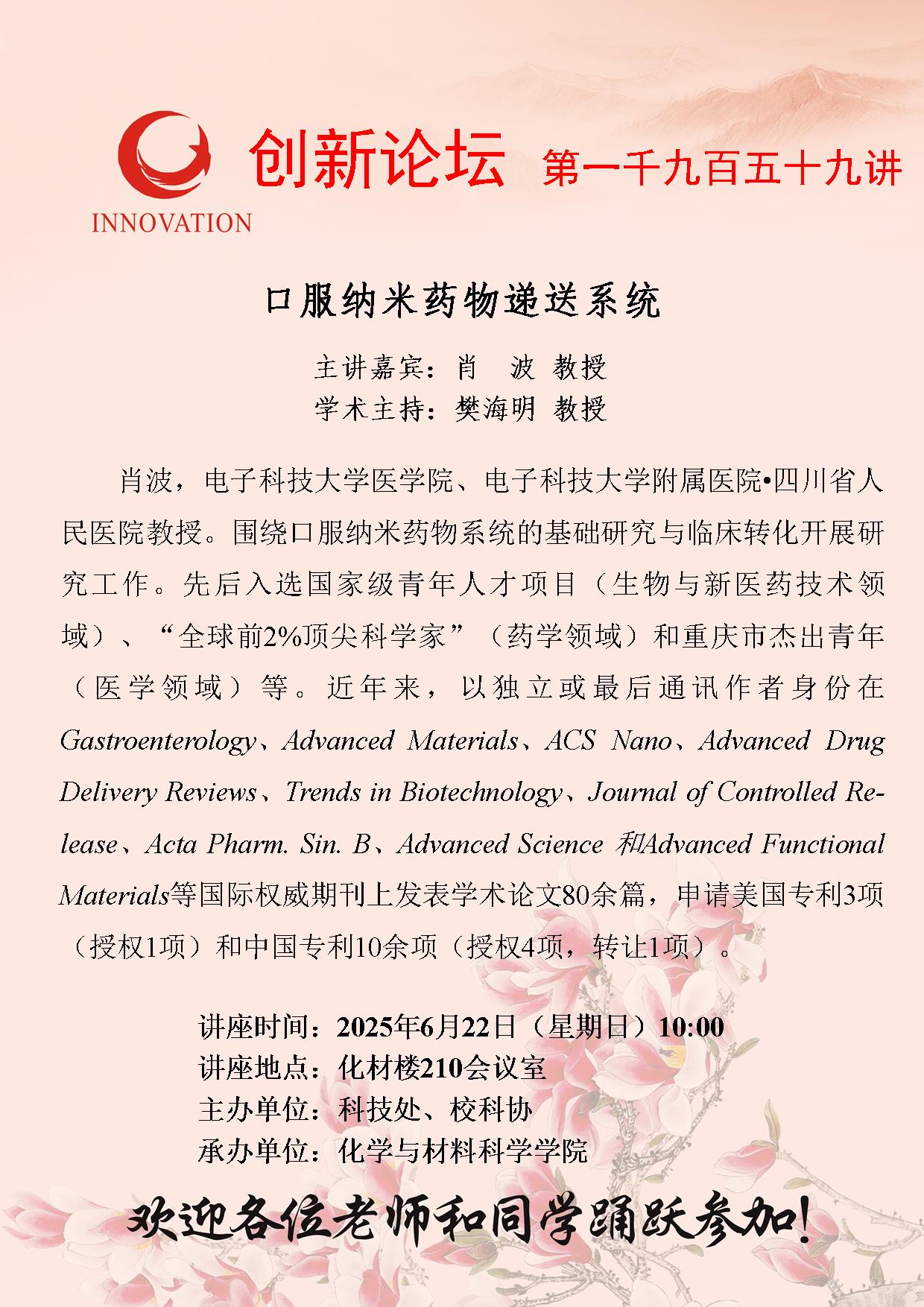 bat365正版唯一官网创新论坛第一千九百五十九讲: 口服纳米药物递送系统