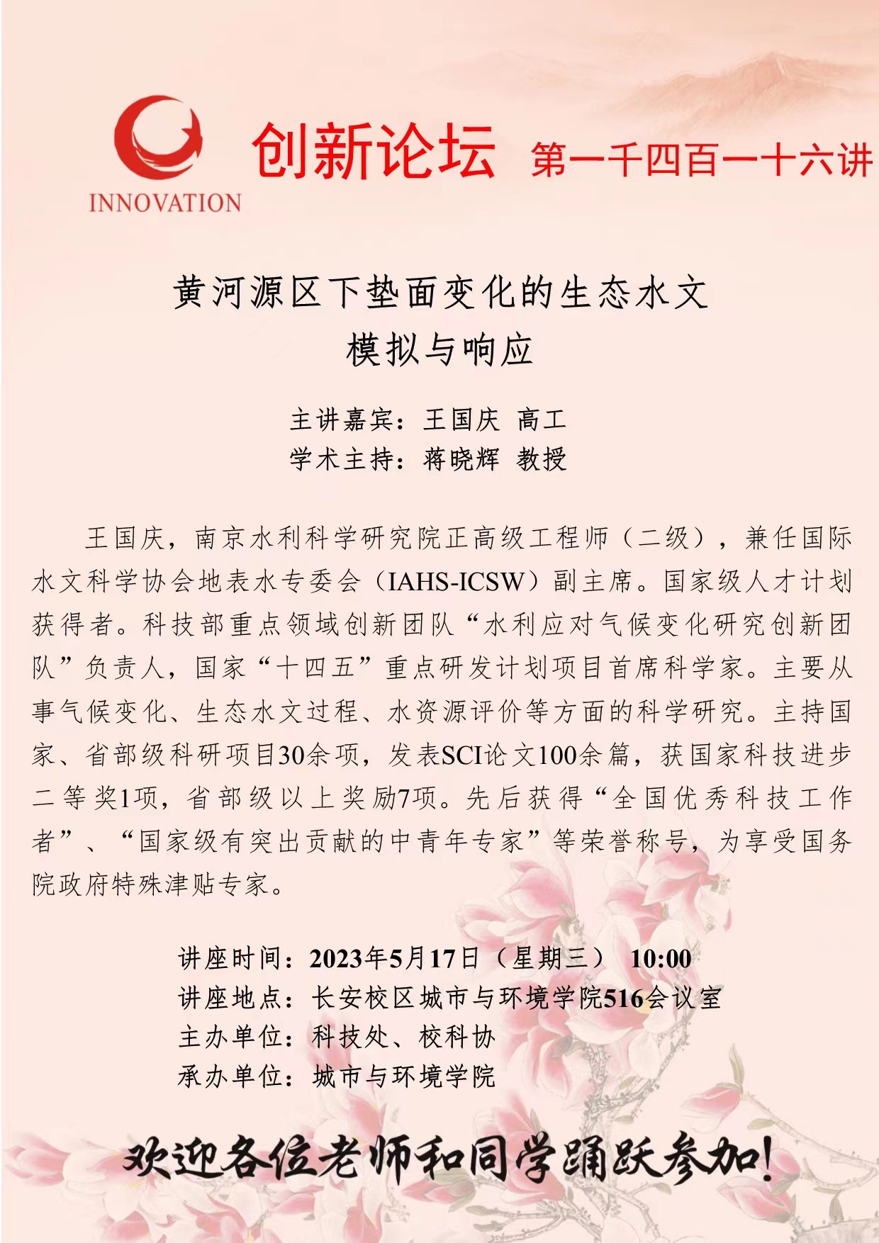 bat365正版唯一官网创新论坛第一千四百一十六讲:黄河源区下垫面变化的生态水文模拟与响应