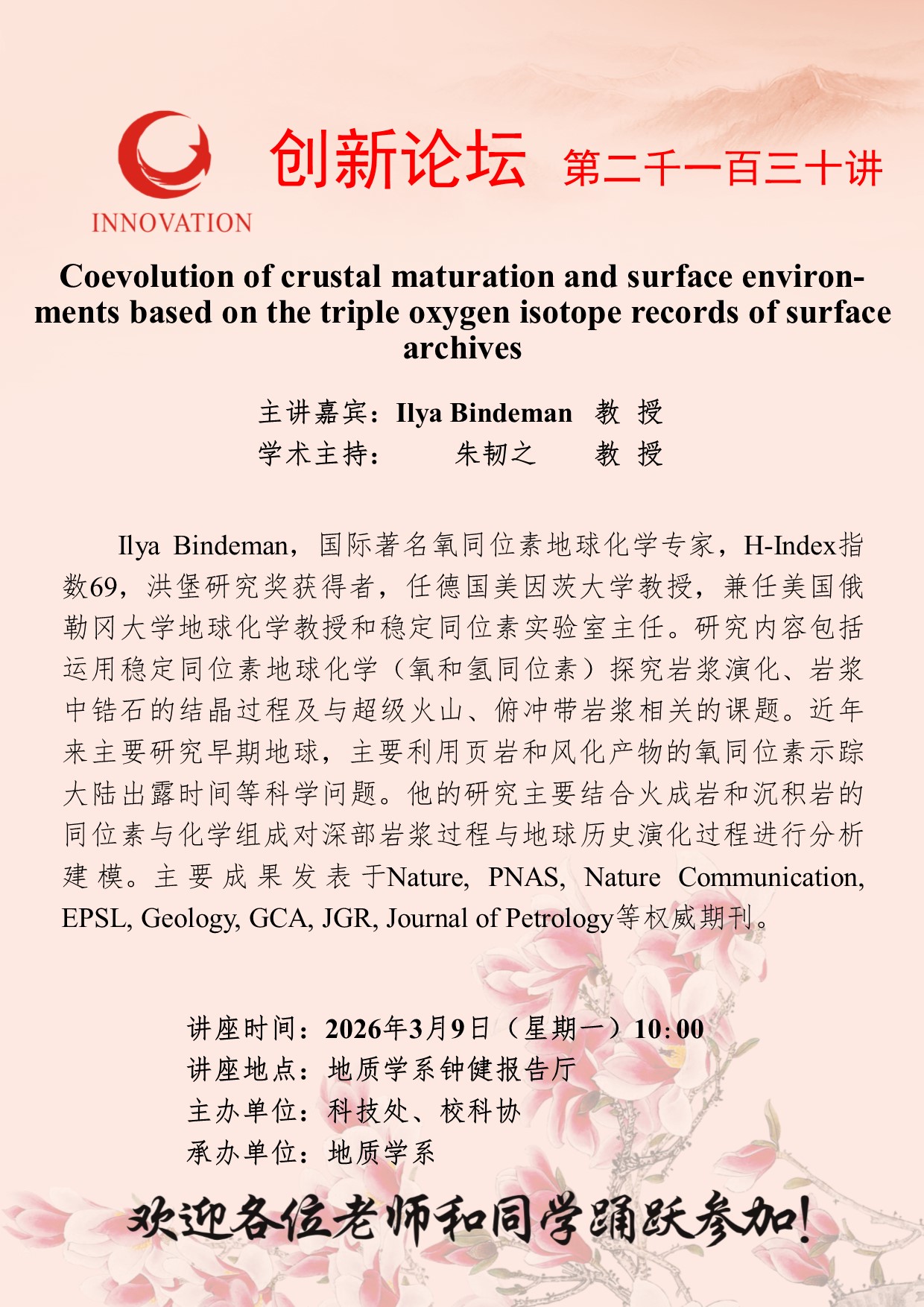 bat365正版唯一官网创新论坛第两千一百三十讲:Coevolution of crustal maturation and surface environ-ments based on the triple oxygen isotope records of surface archives