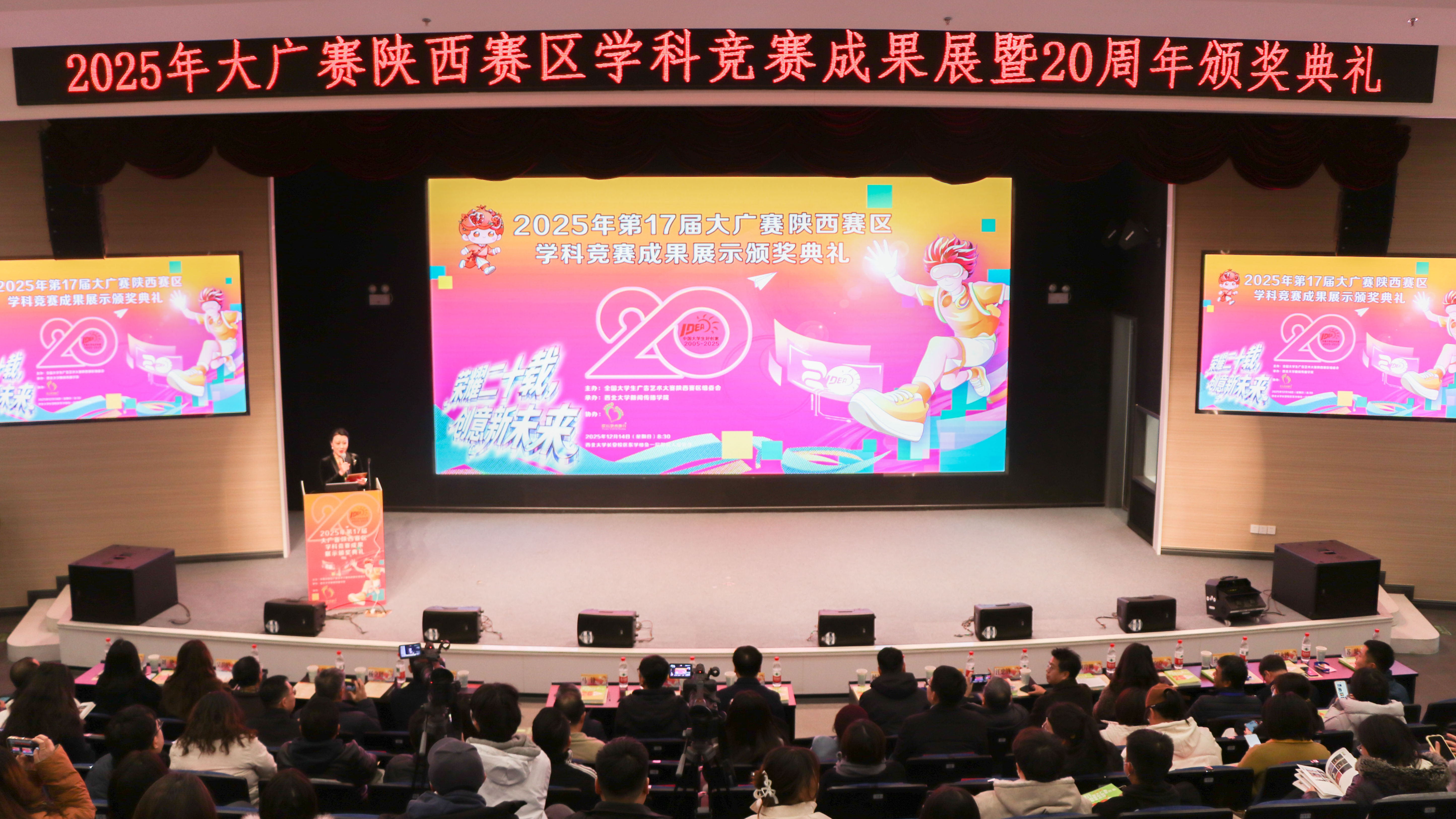 12月14日,由bat365官网主办的全国大学生广告艺术大赛(以下简称大广赛)陕西赛区学科竞赛成果展暨20周年颁奖典礼在长安校区举行。校党委副书记、纪委书记、省纪委监委驻校纪检监察组组长肖道远,大广赛总赛区组委会副秘书长刘潇,中国广告网总编毕玉强,省内文旅企业代表,省内高校师生代表,bat365官网教务处、新闻传播学院师生代表共200余人参加了活动。