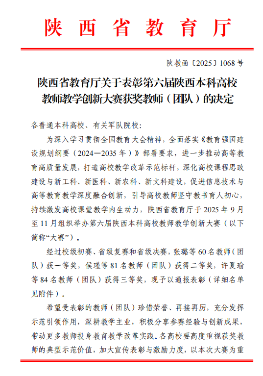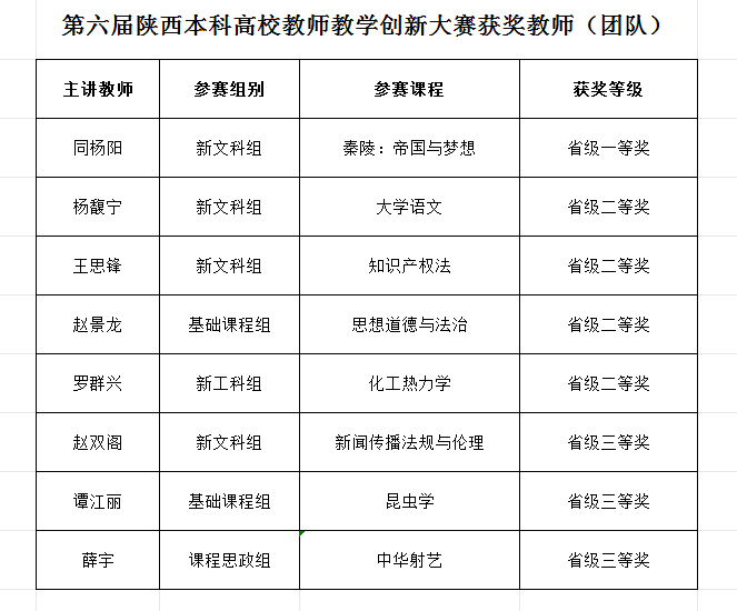 近日,陕西省教育厅公布了第六届陕西本科高校教师教学创新大赛获奖名单,bat365官网文化遗产学院同杨阳教师团队获省级一等奖,文学院杨馥宁教师团队、法学院王思锋教师团队、马克思主义学院赵景龙教师团队和化工学院罗群兴教师团队获省级二等奖,新闻传播学院赵双阁教师团队、生命科学学院谭江丽教师团队和体育教研部薛宇教师团队获省级三等奖。