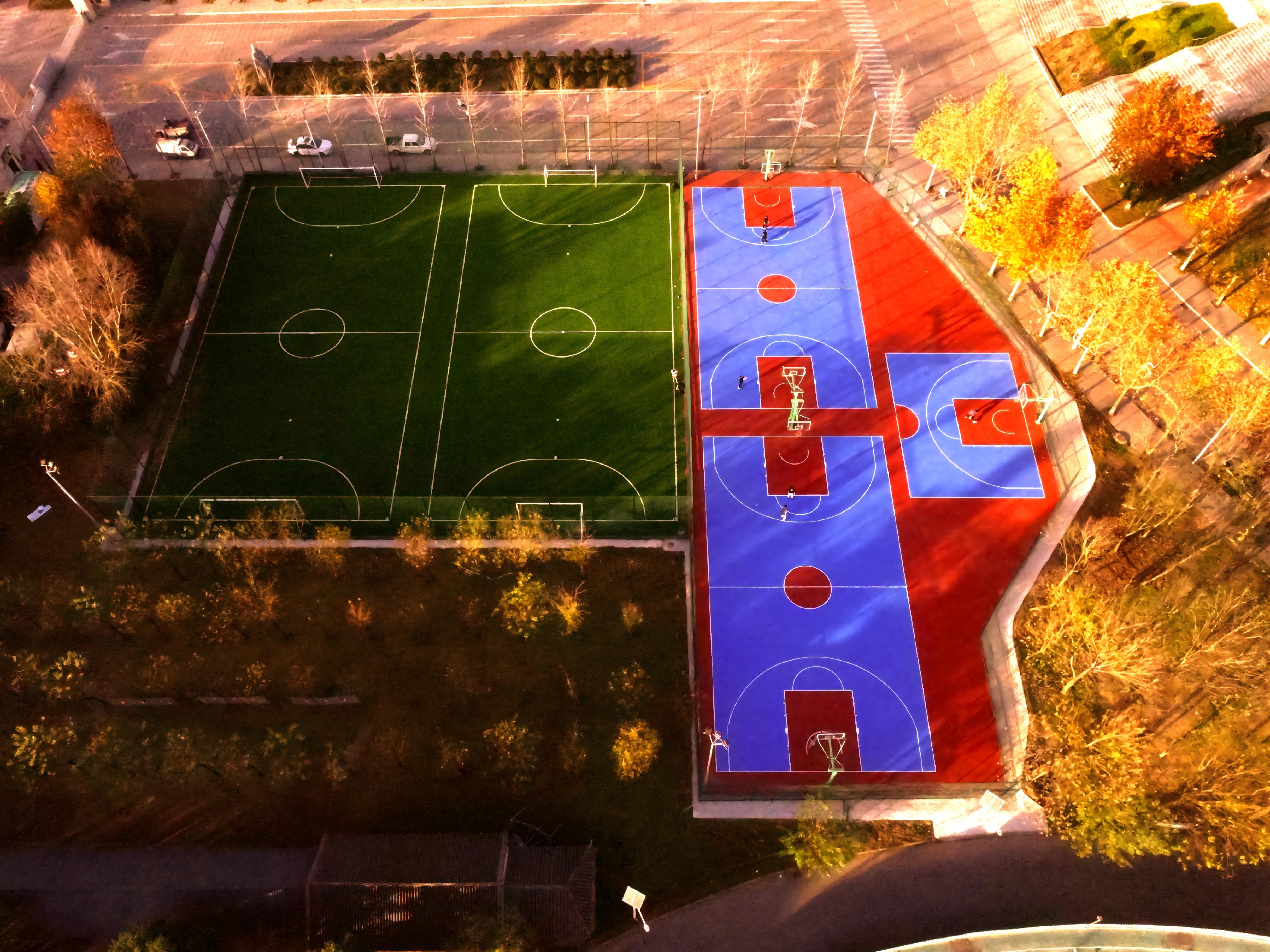 新建运动场地位于校园西门南侧,场地包含两个五人制人工草坪足球场、两个PU篮球场和一个篮球半场,并配备完善的照明系统与安全防护设施。设计上充分融合环保理念,采用环保型运动材料,确保场地耐磨、防滑、抗老化,同时满足全天候使用需求。