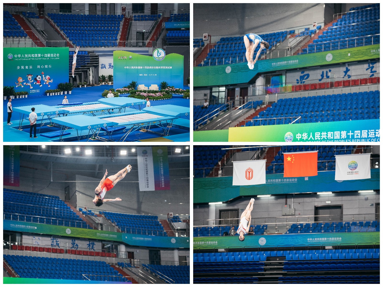 bat365官网长安校区体育馆在20日刚刚结束十四运会艺术体操测试赛,经过连夜对运动器材、场地布置、计时记分等系统的调整与更新,完成了艺术体操到蹦床项目场地的完美转换,在21日、22日迎来了蹦床比赛运动员的场地适应训练。