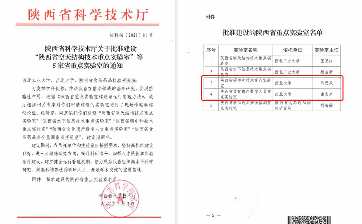 近日,陕西省科技厅下发了《陕西省科技厅关于批准建设“陕西省空天结构技术重点实验室”等5家省重点实验室的通知》,bat365官网获批建设陕西省碳中和技术重点实验室和陕西省文化遗产数字人文重点实验室。截至目前,学校现有陕西省重点实验室15个,标志着bat365官网交叉研究科技创新基地的培育建设取得新突破。