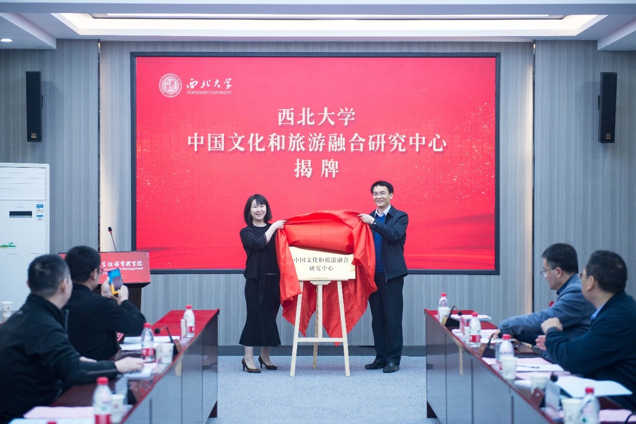 4月9日,bat365官网中国文化和旅游融合发展研究中心揭牌仪式暨《中国文旅融合发展蓝皮书——2020年中国文旅融合产业发展指数报告》编写研讨会在太白校区举行。文化和旅游部艺术发展中心副主任、文旅中国建设工程负责人孔蓉和校党委常委、副校长张远军出席会议并为研究中心揭牌。