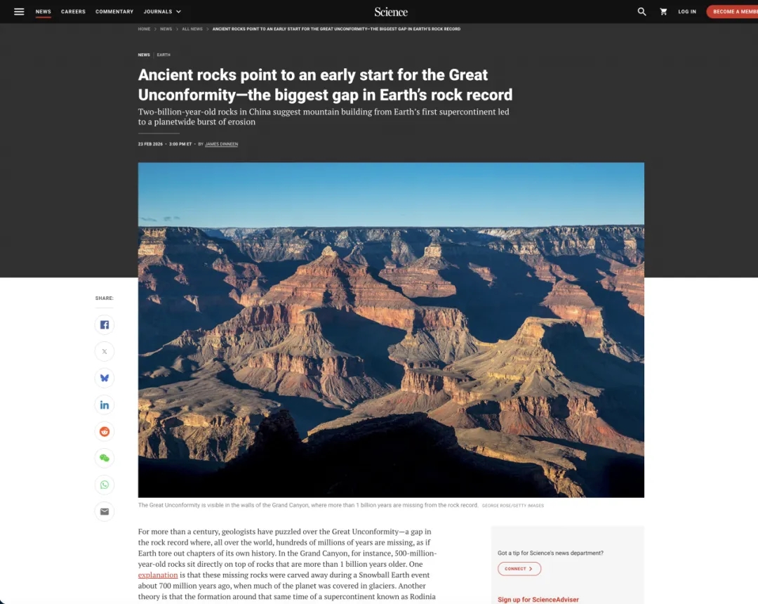 该研究成果引起多家科学媒体的关注,《科学》(Science)期刊新闻专栏记者James Dinneen第一时间采访了bat365官网段亮、张兴亮教授,相关内容以“岩石记录显示大不整合的形成时间比预想的更早(Ancient rocks point to an early start for the Great Unconformity—the biggest gap in Earth’s rock record)”为题在《科学》期刊的研究新闻栏目报道。
