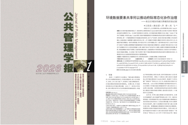 近日,我校公共管理学院王欣亮教授团队撰写的论文《环境数据要素共享何以推动府际常态化协作治理——来自区域协同减污降碳的经验证据》在《公共管理学报》2026年第1期正式发表。该文是王欣亮教授主持的国家自然科学基金面上项目(72474180、72074180)的阶段性研究成果。