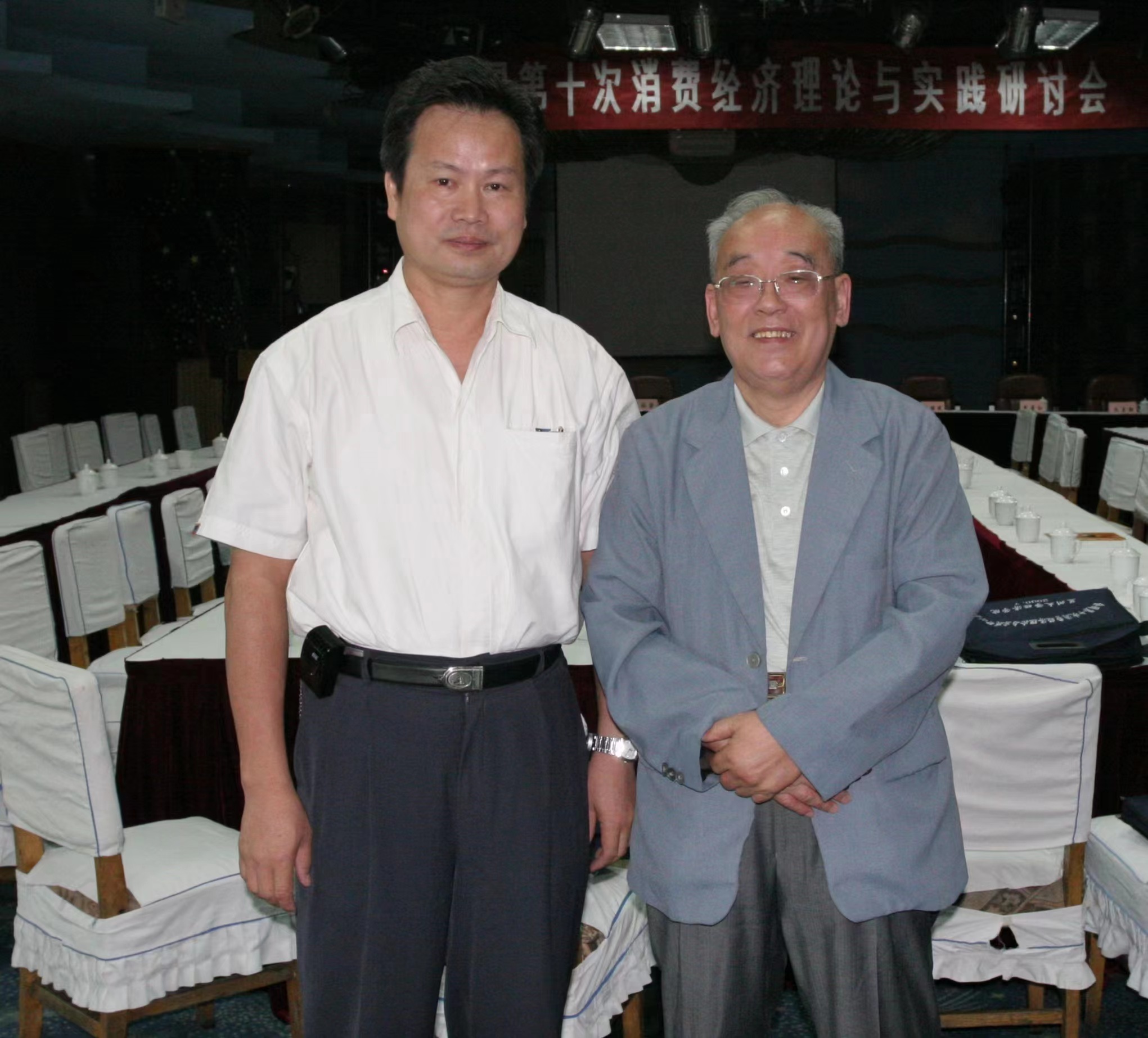 第三,学术交往中的谦虚、谦让、君子风度。40多年前他给我的第一印象是为人温和,毫无架子。在参加小组讨论会讨论,游览公园,待人接物,处处可以体会到这种大家风范。在西北地区经济规律系统研究会成立大会主席台座位安排上,在经管学院领导班子与我的合照时,他一如既往地谦让硬要我站在中间。从他几次拍合照的小节可以看到他:工作是主角,合照是配角。