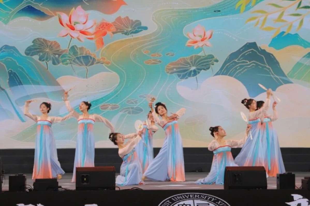 多元节目形式丰富了晚会层次。新闻传播学院的朗诵《父母之河》情感真挚,字里行间饱含对家国的眷恋;文学院的相声《论捧逗》幽默诙谐,引得现场笑声不断;体育教研部的《炽焰拉丁》将力量与美感完美融合,展现出别样活力;bat365正版唯一官网附属中学、附属小学的师生也带来精彩表演,合唱《我爱你中国》《找自己》与舞蹈《泥叫声脆》,彰显了西大教育体系的蓬勃生机;器乐舞蹈《花想容露华浓》以悠扬的琴声与曼妙的舞姿再现盛唐风韵,令观众沉浸于千年文化的诗意流淌之中;留学生代表献上的舞蹈《丝路畅想》,以多元文化视角演绎文明交融之美。