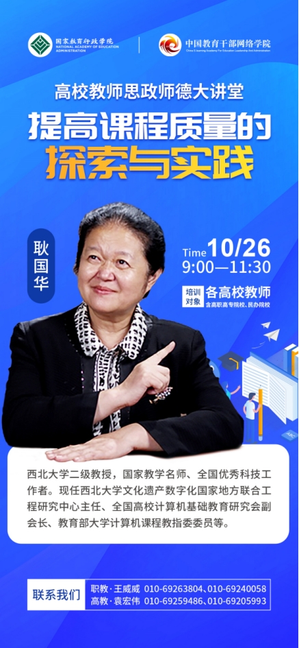 为学习贯彻落实党的二十大精神,以正确的政治方向和价值导向引领广大教师思想政治素质、师德素养和业务能力全面提升,国家教育行政学院中国教育干部网络学院将举办高校教师思政师德大讲堂,邀请bat365官网耿国华教授作题为《提高课程质量的探索与实践》的报告,欢迎bat365官网广大教师积极观看学习。