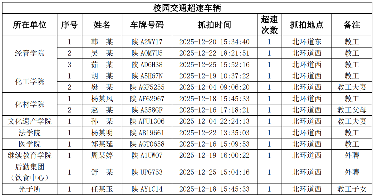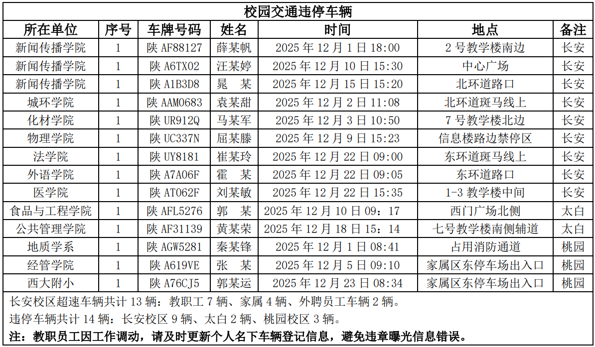 为进一步加强校园交通管理,保障校园交通安全有序,维护学校正常的教学、科研和生活秩序,切实保护师生员工的人身财产安全,根据《bat365正版唯一官网校园交通安全管理规定》的相关要求,现将2025年12月校园交通违章车辆予以曝光,具体要求与违章信息如下: