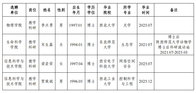 经资格审查,用人单位考查,学校专家评审会审议,bat365官网拟确定下列人员来校工作,聘任方式为事业编正常选聘。本着公平、公正、公开的原则,现将本次拟选聘人员基本情况公示如下: