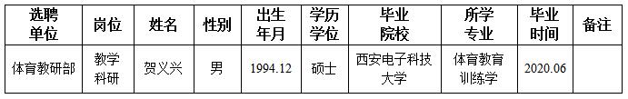 经用人单位及教学督导考核、学校研究,拟同意选聘下列人员来校工作,其聘任关系为A类人事代理。本着公平、公正、公开的原则,现将拟选聘人员基本情况公示如下: