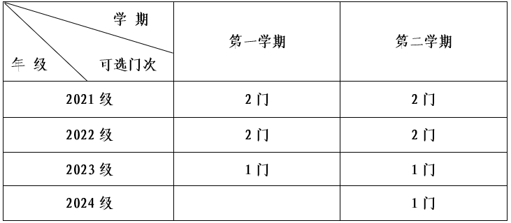 1.根据学校教学计划安排和教学资源设置情况,在选课门次上,一年级新生第一学期暂不修读通识教育选修课程,第二学期每人限选1门、二年级学生每人每学期限选1门、三年级和四年级学生可在上下两学期交错选课2门。具体可选课门次如下表所示: