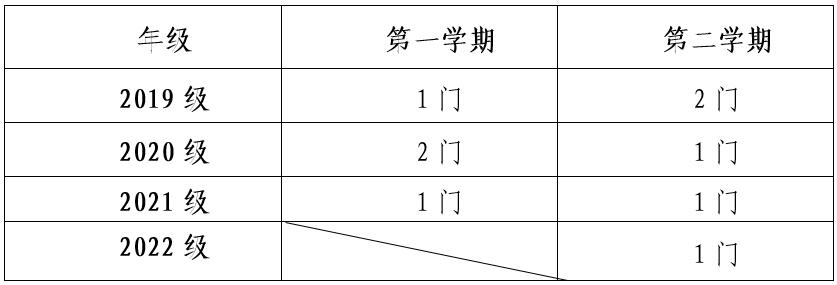 1.根据学校教学计划安排和教学资源设置情况,在选课门次上,一年级新生第一学期暂不修读通识教育选修课程,第二学期每人限选1门、二年级学生每人每学期限选1门、三年级和四年级学生可在上下两学期交错选课1-2门。具体可选课门次如下表所示: