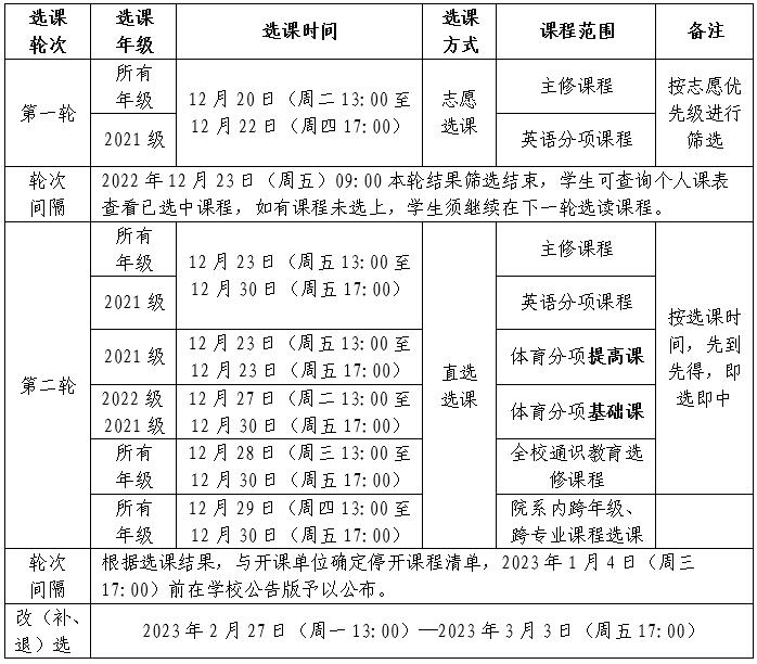 2022—2023学年第二学期课程选课分为正选和改(补、退)选。正选在12月20日(13:00)—12月30日(17:00)进行,分为两轮。改(补、退)选在2023年2月27日(13:00)—2023年3月3日(17:00)进行。现将具体事宜安排如下: