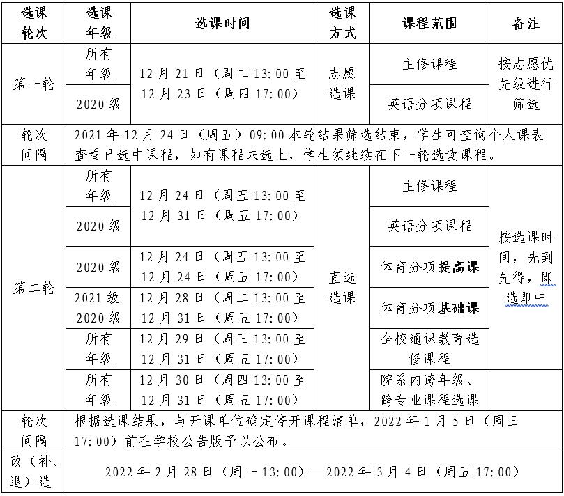 2021—2022学年第二学期课程选课分为正选和改(补、退)选。正选在12月21日(13:00)—12月31日(17:00)进行,分为两轮。改(补、退)选在2022年2月28日(13:00)—2022年3月4日(17:00)进行。现将具体事宜安排如下: