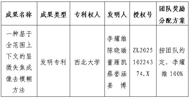 该发明公开了一种基于全范围上下文的显微失焦成像去模糊方法。该发明从全范围上下文信息出发,在综合考虑显微图像背景杂散光、离焦程度以及细节纹理等因素的基础上,对失焦退化图像的高质量重建,有效提升显微图像的清晰度与可辨识度,为后续精确观测与定量分析提供有力保障。