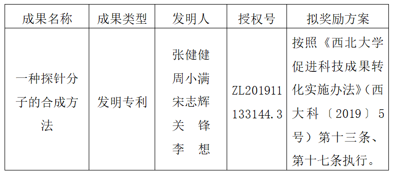 按照《bat365正版唯一官网促进科技成果转化实施办法》(西大科〔2019〕5号)相关规定,拟对bat365官网化学与材料科学学院张健健副教授作为成果负责人的1项发明专利权实施转化,现将相关信息公示如下: