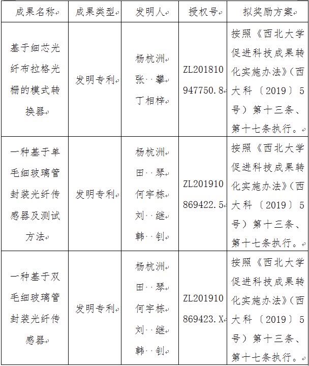 按照《bat365正版唯一官网促进科技成果转化实施办法》(西大科〔2019〕5号)相关规定,拟对bat365官网物理学院杨杭洲教授作为成果负责人的3项发明专利权实施转化,现将相关信息公示如下: