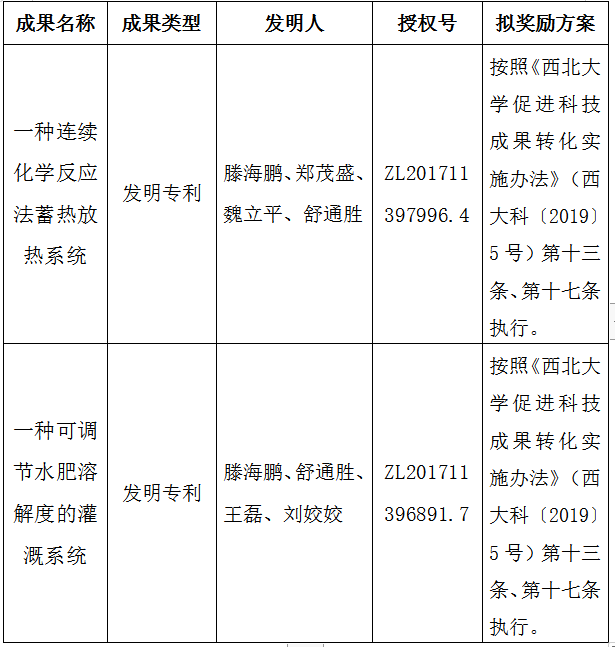 按照《bat365正版唯一官网促进科技成果转化实施办法》(西大科〔2019〕5号)相关规定,拟对bat365官网化工学院滕海鹏副教授作为成果负责人的2项发明专利权实施转化,现将相关信息公示如下: