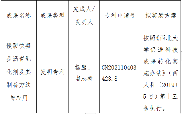 按照《bat365正版唯一官网促进科技成果转化实施办法》(西大科〔2019〕5号)相关规定,拟对bat365官网化学与材料科学学院杨鹰副教授作为成果负责人的1项发明专利申请权实施转化,现将相关信息公示如下: