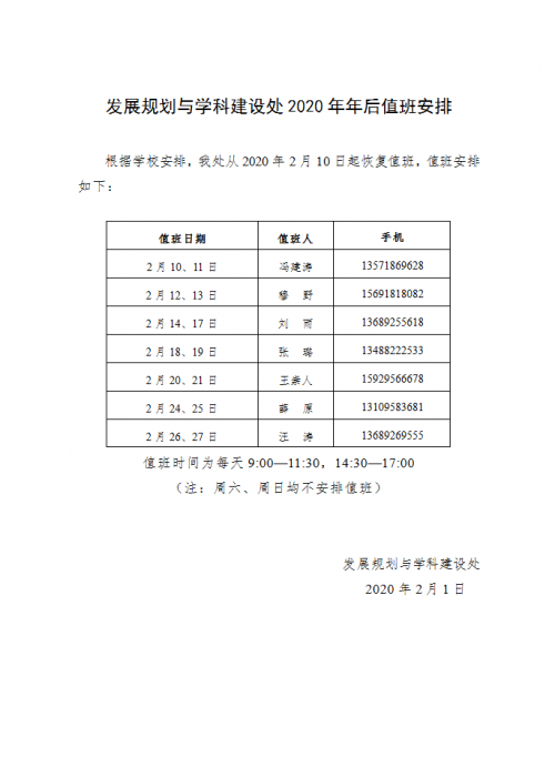 发展规划与学科建设处2020年年后值班安排