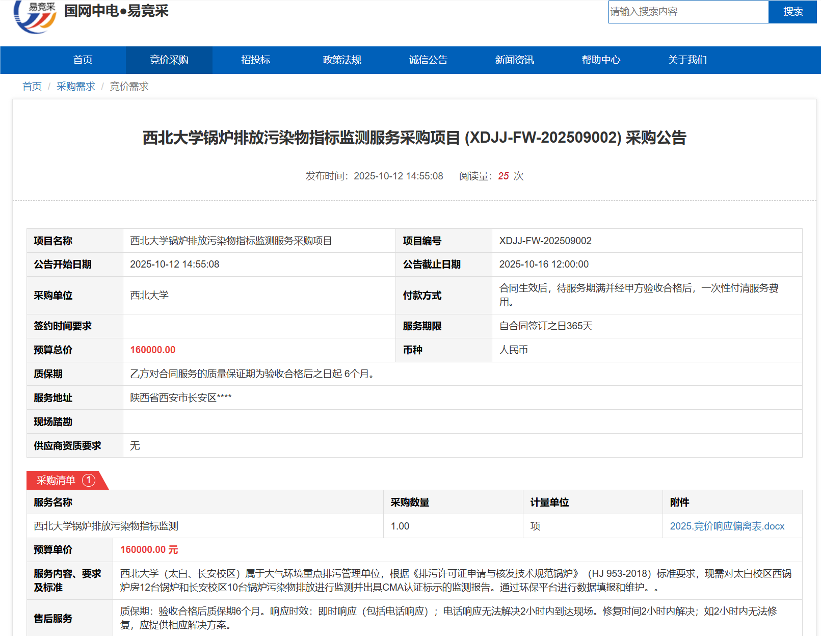 bat365正版唯一官网锅炉排放污染物指标监测服务采购项目(XDJJ-FW-202509002)竞价采购公告