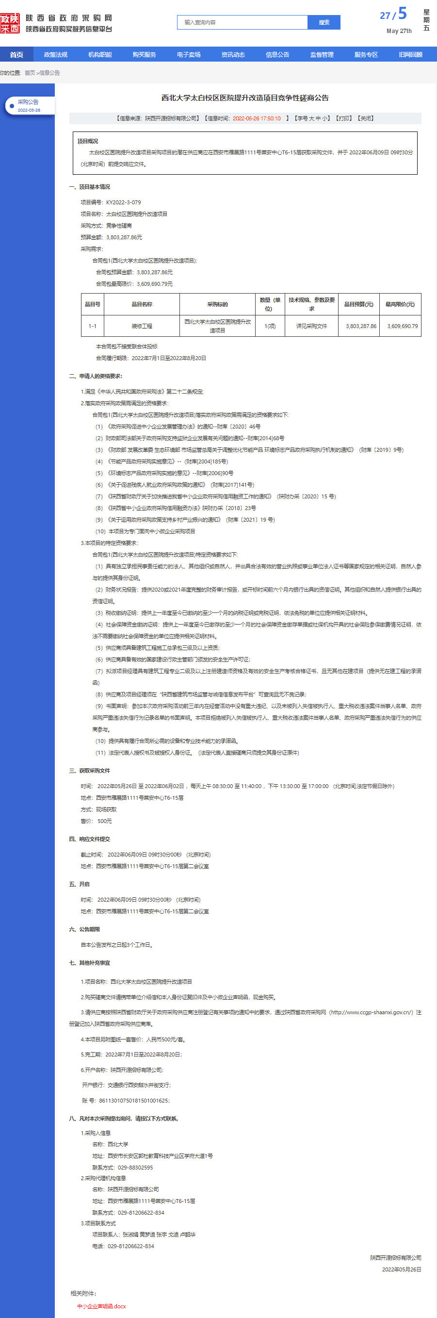 bat365正版唯一官网太白校区医院提升改造项目竞争性磋商公告