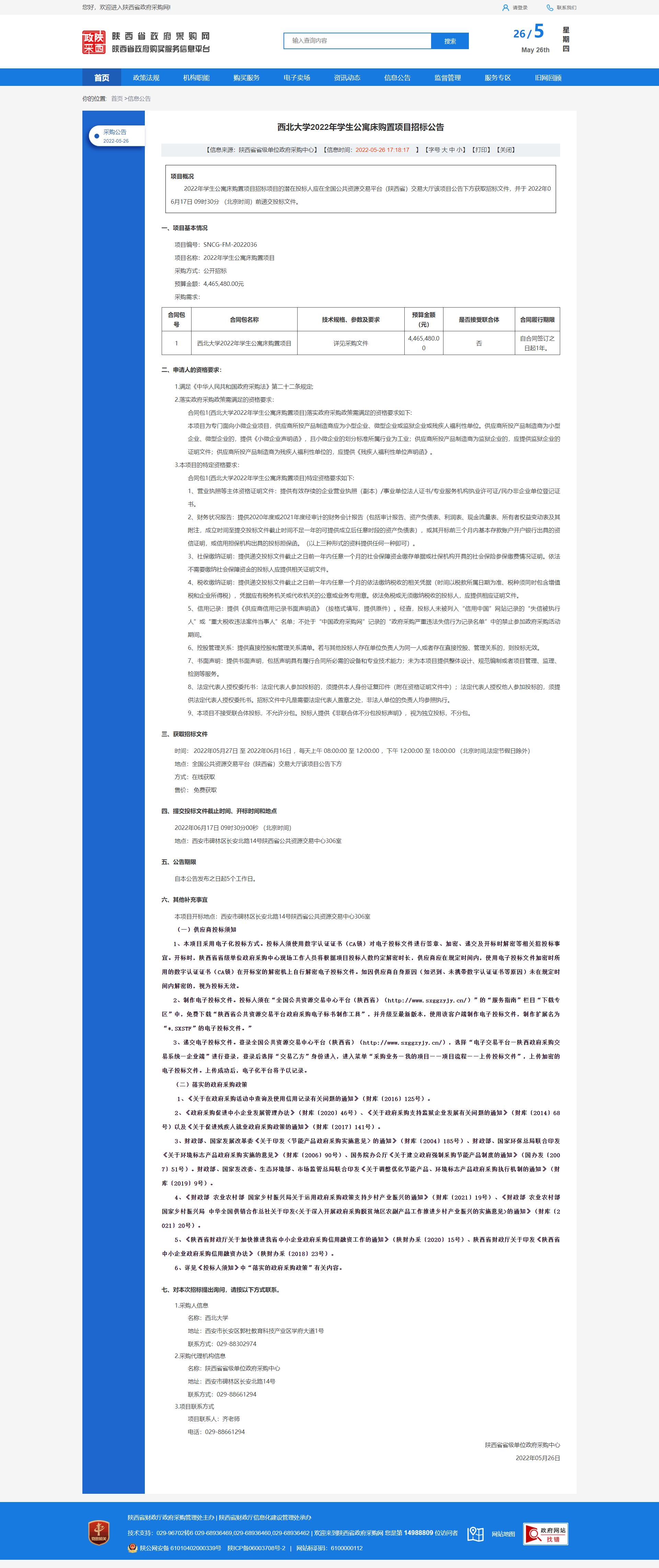 原公告链接:http://www.ccgp-shaanxi.gov.cn/freecms/site/shaanxi/ggxx/info/2022/8a69c34a80cf8c1d0180d6127e5a14f4.html?noticeType=001011¬iceId=0697247a-dcd5-11ec-9a8e-08c0eb20c666