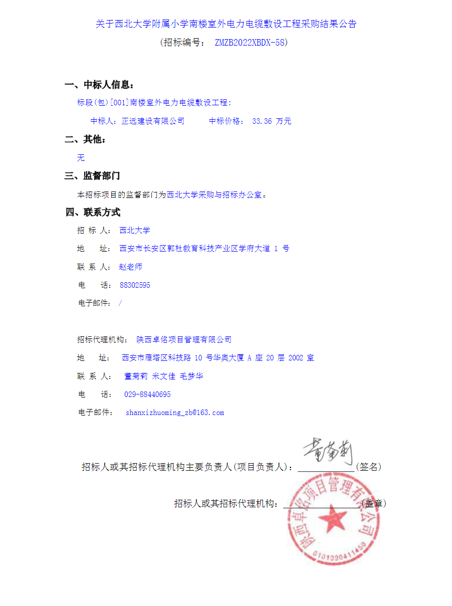 关于bat365正版唯一官网附属小学南楼室外电力电缆敷设工程采购结果公告