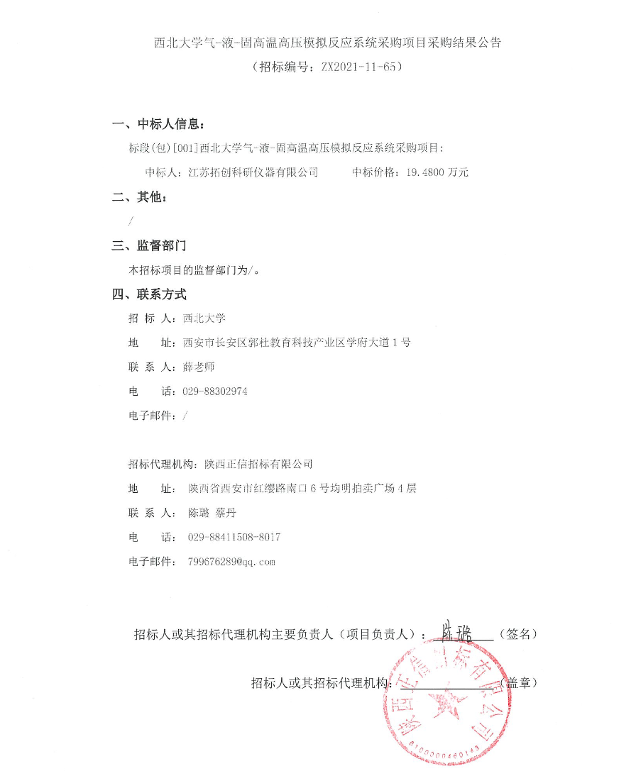 bat365正版唯一官网气-液-固高温高压模拟反应系统采购项目采购结果公告