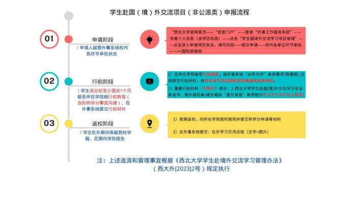3. 申请学生在确定录取后,应及时履行出国(境)前相关行前手续。有关本项目学生的申请、行前、返校阶段情况说明,请见附件3 申报流程说明或下图。