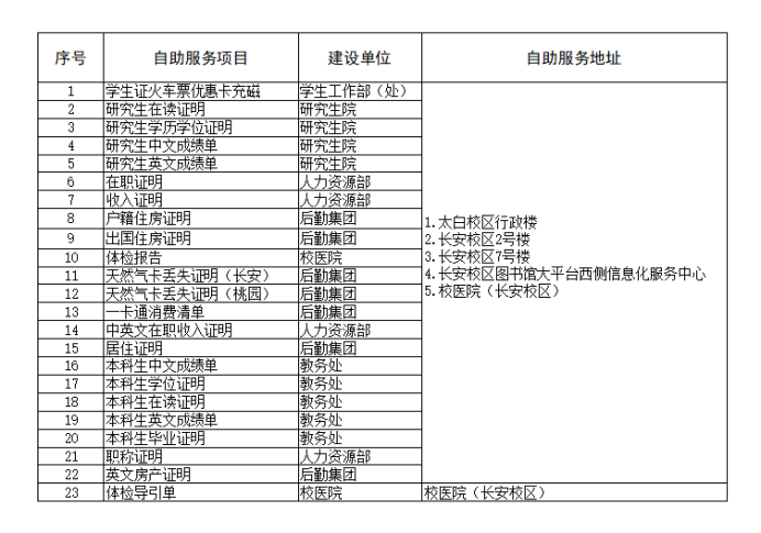 一、信息化自助服务。提供相关证明材料自助打印服务、在校学生学生证火车票充磁服务等,详见下表。