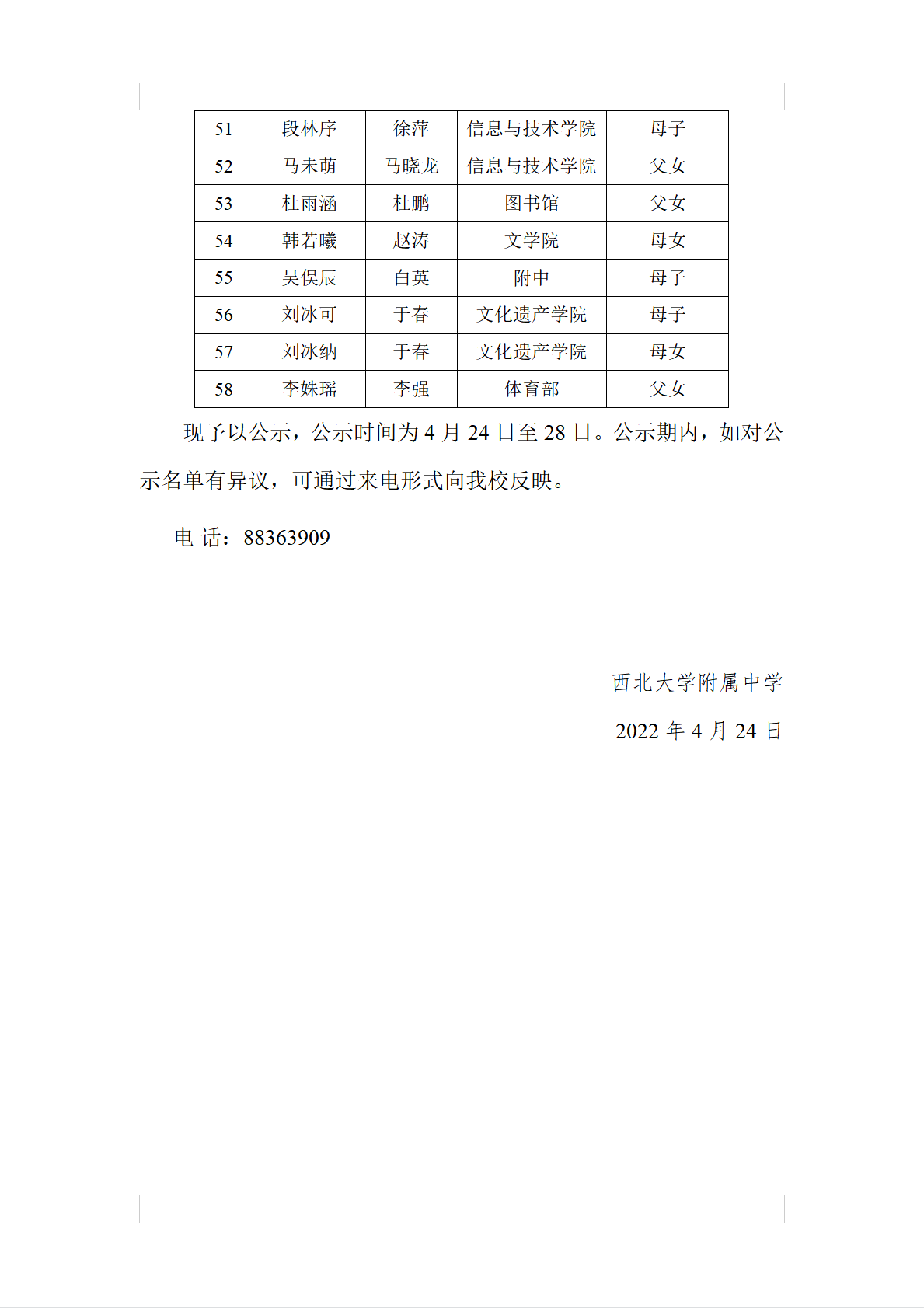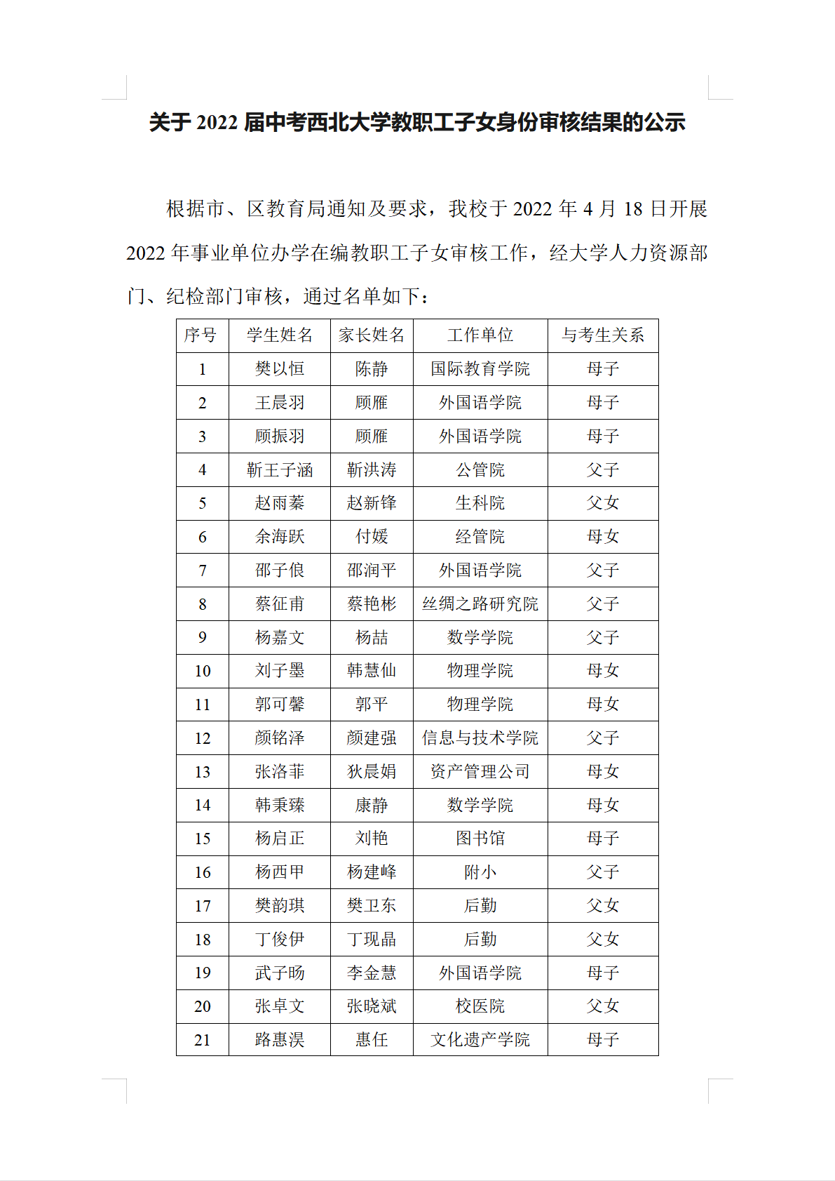 关于2022届中考bat365正版唯一官网教职工子女身份审核结果的公示