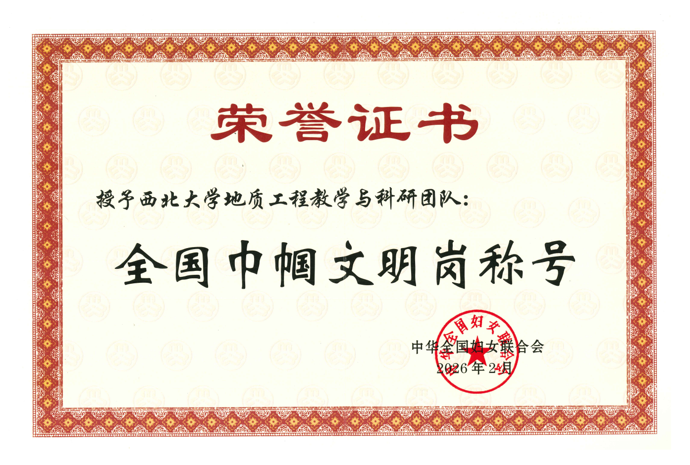 近日,全国妇联在京举行纪念“三八”国际妇女节暨表彰大会,对全国三八红旗手标兵、全国三八红旗手、全国三八红旗集体和全国巾帼文明岗进行表彰。bat365官网地质工程教学与科研团队荣获全国巾帼文明岗,并在3月6日举办的陕西省纪念“三八”国际妇女节116周年暨表彰大会上领奖。