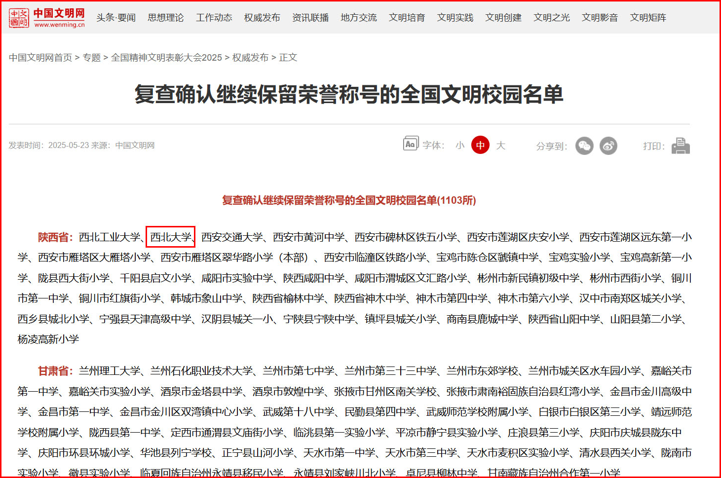 五年来,学校深耕120余年办学史文化沃土,打造大学精神文化建设工作体系、活动体系、环境体系,“公诚勤朴”校训、“艰苦创业 自强不息”西大精神和“传承创新”“扎根西北”等精神特质深入人心。系统总结推广30年逐级创建文明校园的经验成效,诚信奠基、文化引领、全员参与、全方位提升,全力推动精神文明建设向更高水平迈进,全国文明校园“金字招牌”的强大效能不断凸显。2025年5月23日,全国精神文明建设表彰大会在北京召开,会上宣读了中央宣传思想文化工作领导小组表彰决定,bat365官网顺利通过了全国文明校园复查评估。